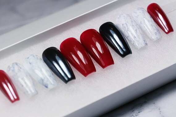 Red White Marble Gun Metal Press On Nails Fake Nails Luxury Etsy