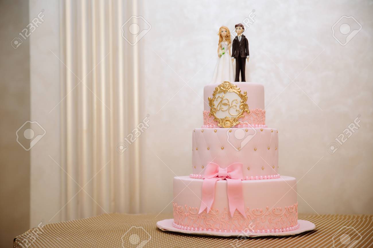 Multilevel Wedding Cake Decorated With Flowers Stands On A Table